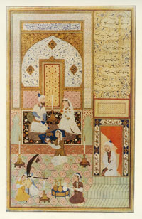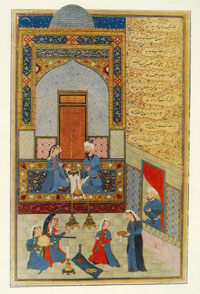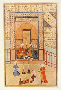 Ikkinchi xikoya . "Bahrom oltin qasrda". Shox sariq libos kiygan rumlik go`zal bilan may ichish arafasida. Quyida musiqachilar ansambli. Bu o`rinda sariq rang bilan bog`liq "lya" pardasi ustuvor bo`lib, u Iroq maqomiga dastlabki tayanch asos sifatida xizmat qiladi. "Lya" tovushi xozirgi kunda ham Iroq nomi bilan ma'lum maqomlarning tayanch pardasi xisoblanadi. |
