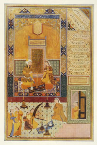 Shu bilan birga "Sab'ai sayyor"dagi etti xikoyaga ishlangan miniatyuralar asosida etti maqom har birining pardalarini aniqlab olish imkoninini mavjud ko`rinadi. Shundayki, adabiy manbaga ko`ra etti xikoyaning har biri muayyan rang bilan muqim bog`langan xolda bayon etiladi. Nizomiy Ganjaviyning "Xaft paykar" va Xisrav Dehlaviyning "Hash bihisht" dostonlariga ishlangan miniatyuralar hikoyalarda ko`zda tutilgan ana shu rang talablariga deyarli mos keladi. Biroq Alisher Navoiyning "Sab'ai sayyor" dostoniga ishlangan miniatyuralarda o`zgacha vaziyatni ko`ramiz. Masalan, birinchi xikoya qora qasrda, unda hozir bo`lgan Bahrom va hind go`zali qora liboslarda, qadahdagi maylar ham, xullas barcha borliq qora rangda bo`lishi kerak edi. Biroq buning o`rniga "Bahrom qora qasrda" mo`'jaz tasvirida etti xil rangning o`zaro go`zal uyg`unlik kashf etganini ko`ramiz. Bu hol ayniqsa musiqachilar tasvirida yaqqol namoyon bo`ladi va turli o`zgarishlar bilan keyingi xikoyalarga ishlangan tasvirlarda ham zuhur etadi. Faraz qilishimizcha, adabiy manbadan bu alfozda "chekinishdan" maqsad xikoyalar zamirida mavjud botiniy musiqani, aniqroq aytganda, maqom pardalari va navolarini ranglar vositasida imkon qadar ifoda ettirish istagidan kelib chiqqan. Bu kabi murakkab ijodiy vazifani musavvirlar bevosita hazrat Navoiy ko`rsatmasi asosida amalga oshirgan bo`lsalar ham ajab emas. Shu asnoda miniatyura tasvirlarida ramziy mavjud maqom pardalarini aniqlashga urinib ko`ramiz. |